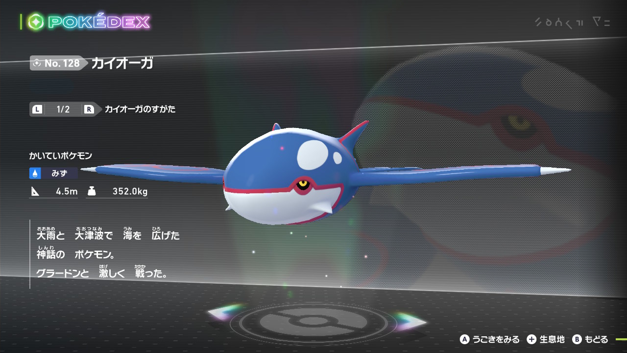 カイオーガはなんか見慣れてしまっているのが。笑 種族値はあがったとはいえ、特性の雨や「しおふき」がなくなってグラードンとの比較もあわせて弱体化している感があるのが手伝っているかも。(でも探索方面はカイオーガがいい)