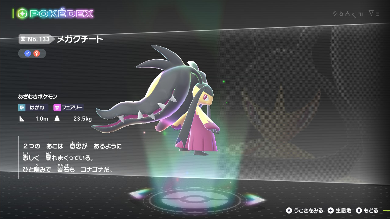 メガディアンシーを使う場合は、「ドレインキッス」と同じく近接技の「マジカルシャイン」「じゃれつく」を使うのがおすすめ。