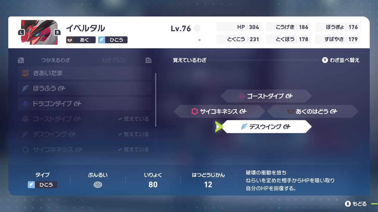 技は「デスウイング」「あくのはどう」「ぼうふう」「サイコキネシス」です。「デスウイング」は威力80の回復もできる飛行特殊技ですね。